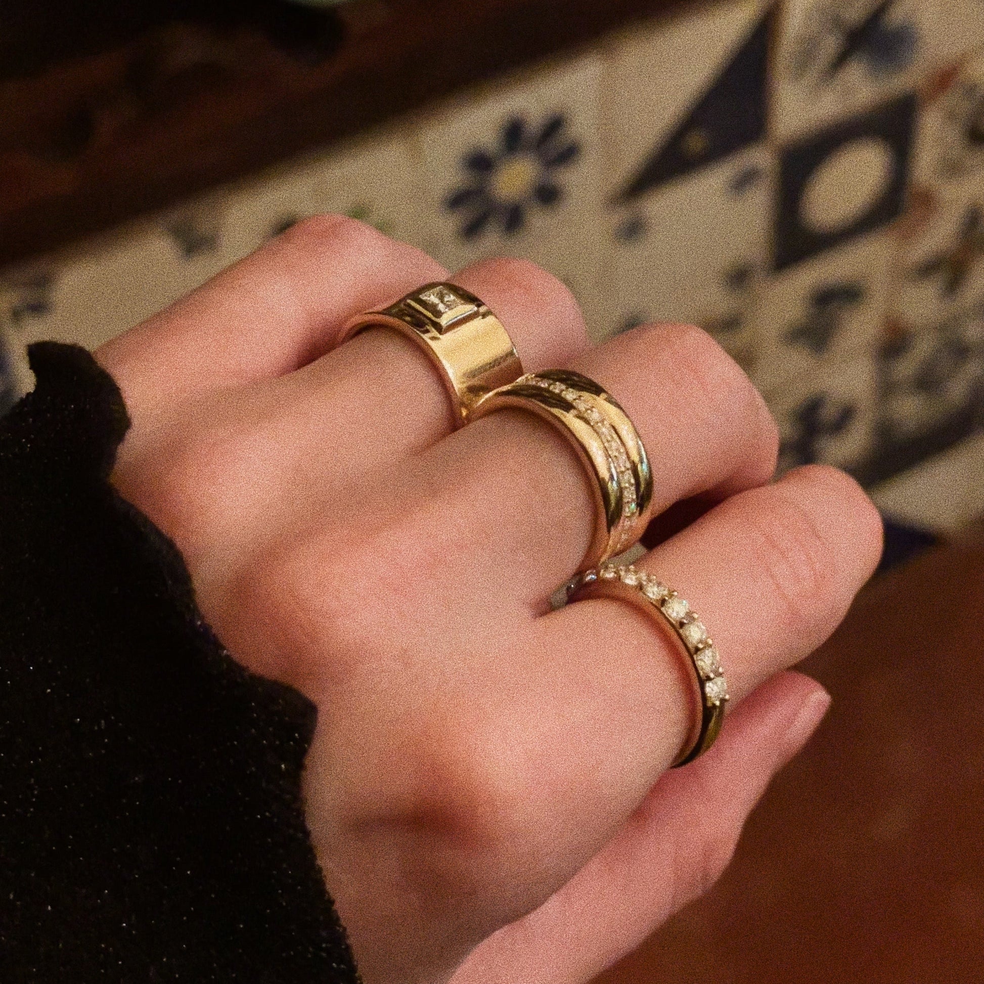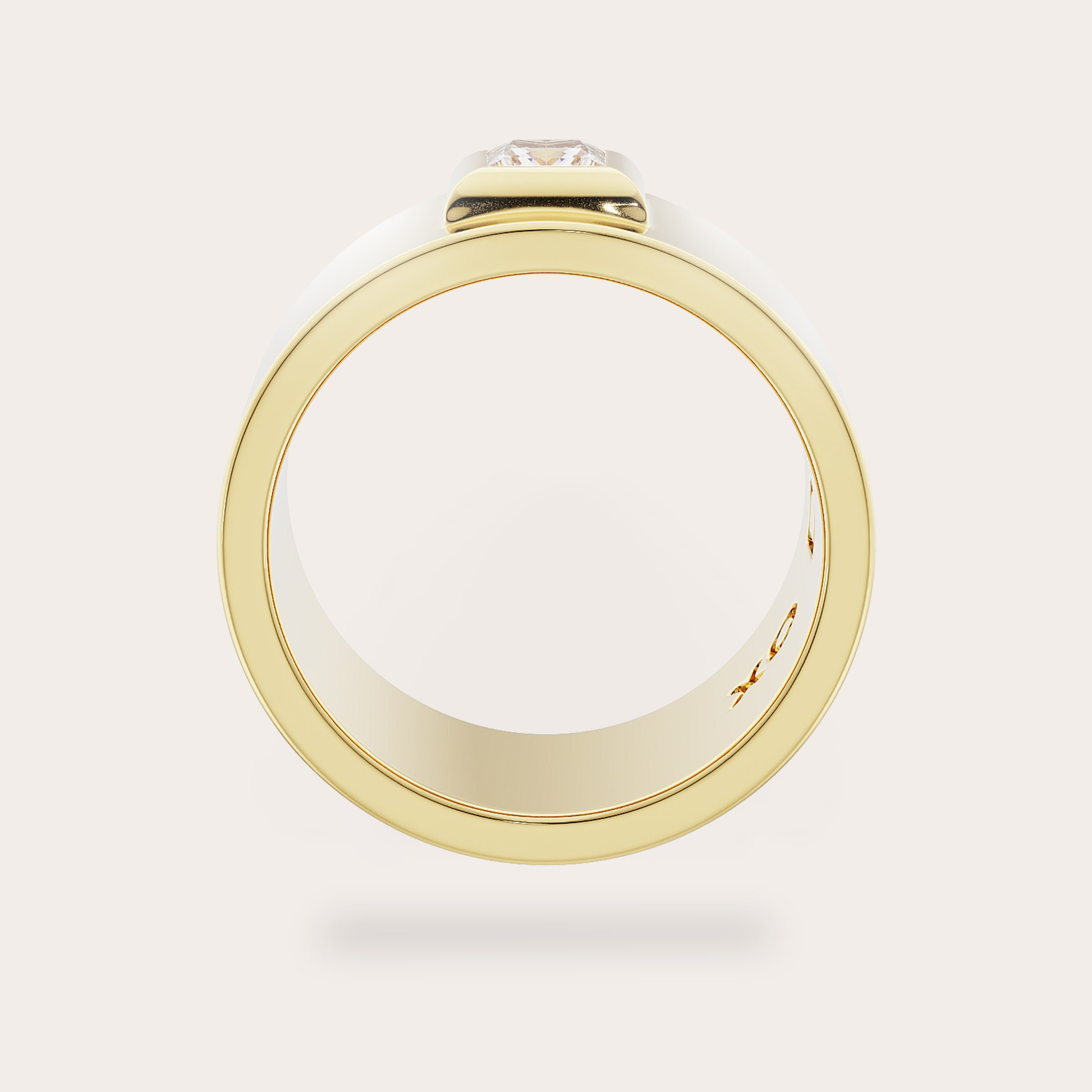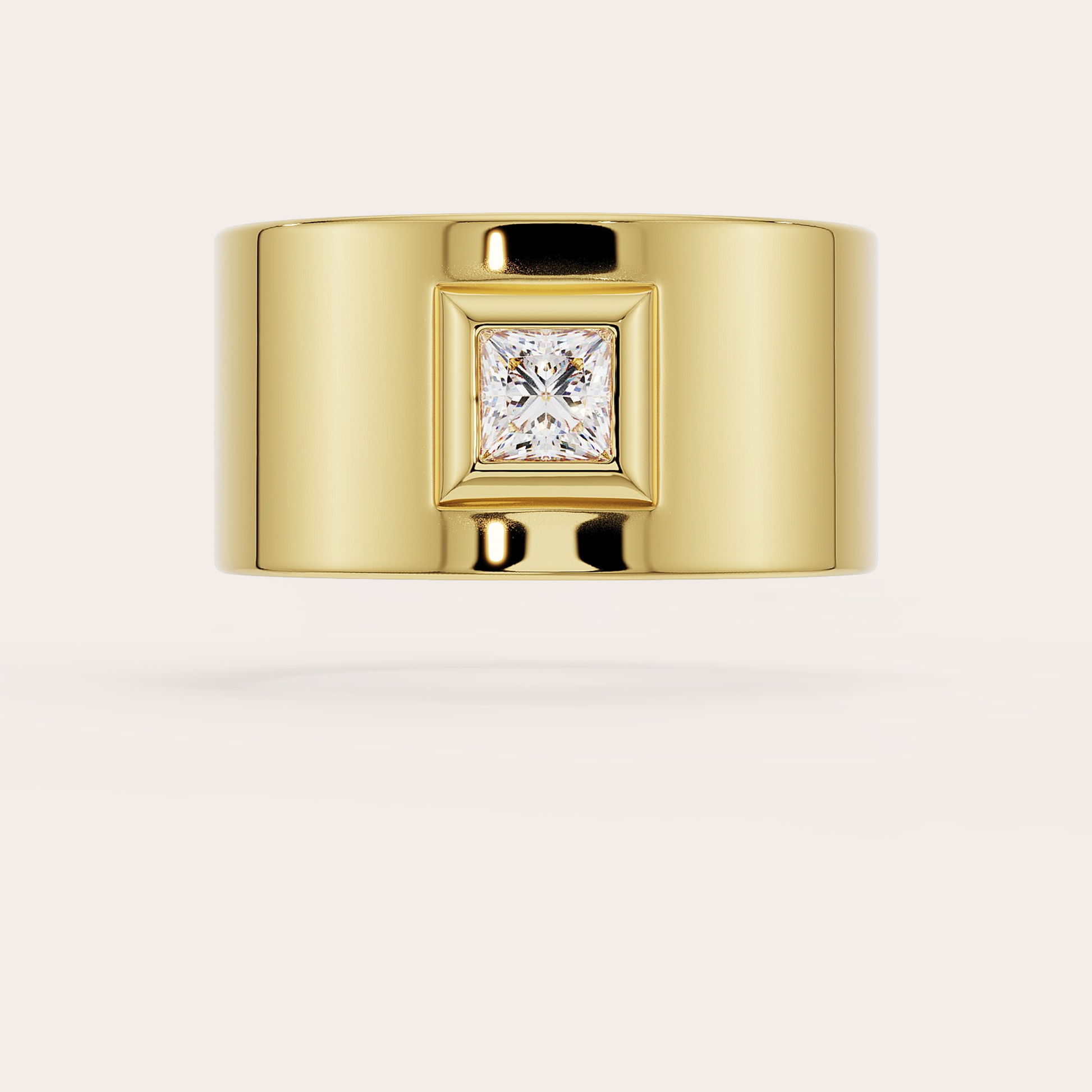 Inspired by the parts of our past that propel us forward, the Relic Band is a shield in the form of a "cigar" band. High polish 14 karat gold presents a princess cut diamond in a raised bezel. Custom stone selection available. Each Relic Band is made-to-order and requires a lead time of 4 to 6 weeks. If your size is not shown, please choose the option closest and leave a note at checkout.